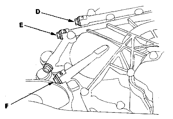 6. Connect the oil pressure gauge to the 1st clutch pressure inspection hole (D), 3rd clutch pressure inspection hole (E), and 5th clutch pressure inspection hole (F).