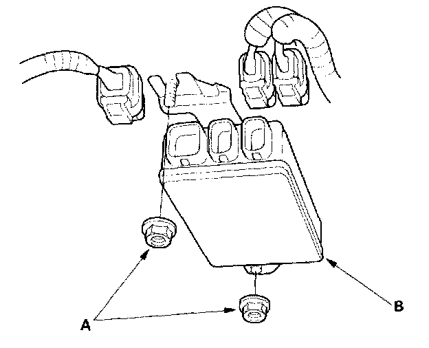 5. Disconnect the connectors. Remove the mounting nuts (A) and the front passenger's weight sensor unit (B) from the seat riser.
