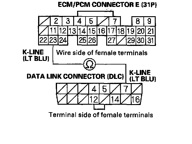 10. Check for continuity between DLC terminal No.7 and ECM/PCM terminal E23.