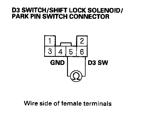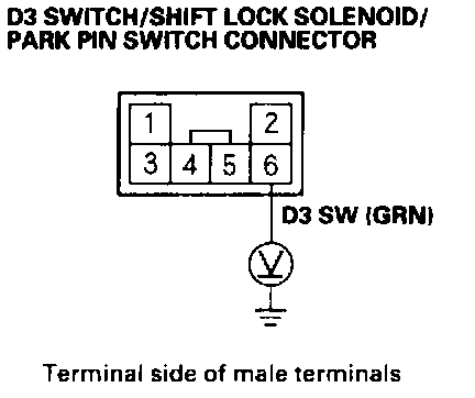3. Check for continuity between D3 switch/shift lock solenoid/park pin switch connector terminal No. 5 and No. 6 at pressing the D3 switch.