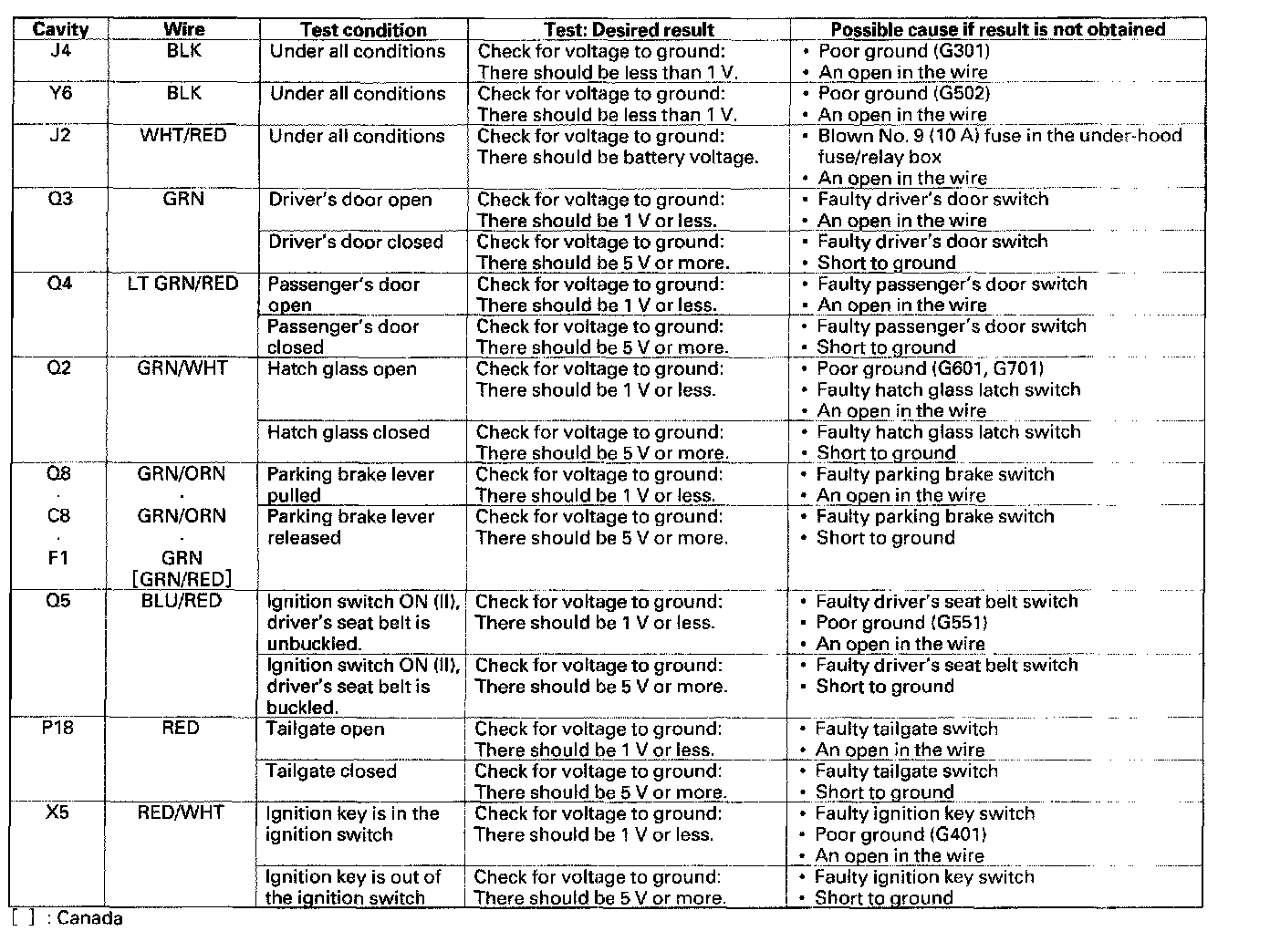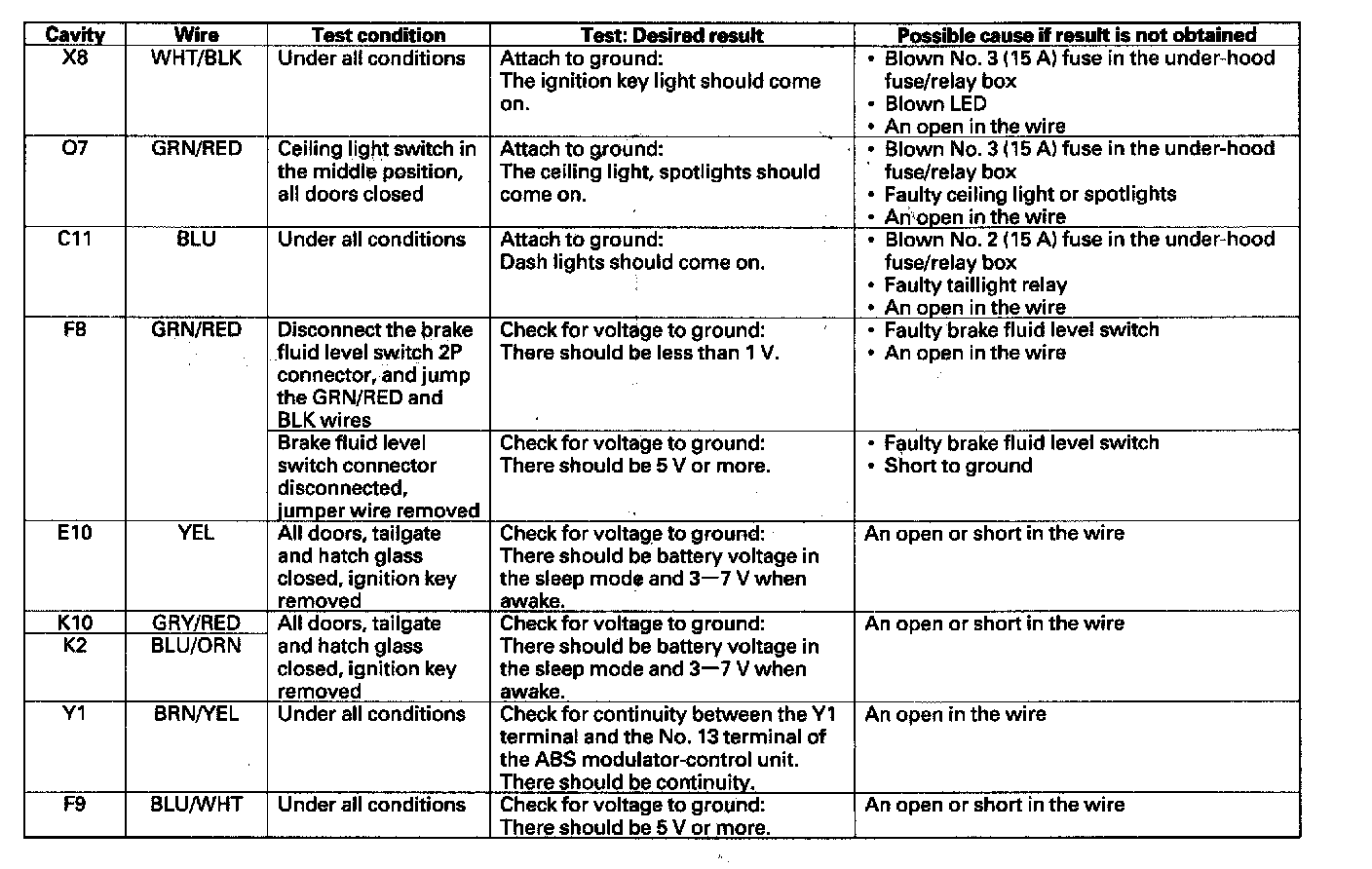 4. Reconnect the connectors to the under-dash fuse/relay box, and make sure these input tests at the appropriate connectors on the under dash fuse/relay box