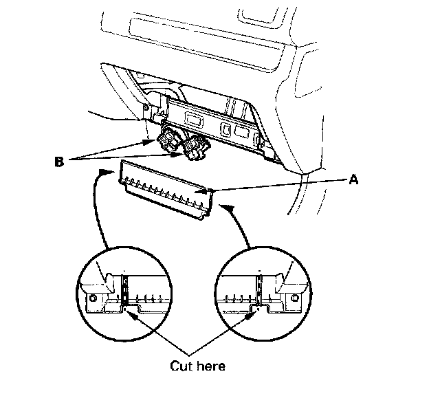 7. Cut the plastic cross brace in the glove box opening with diagonal cutters in the area shown. Remove and discard the plastic cross brace (A)