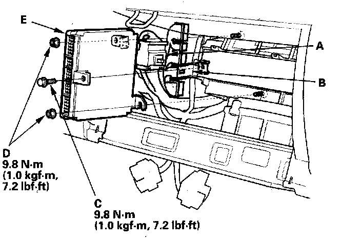 10. Remove the nuts (D), then remove the ECM/PCM (E).