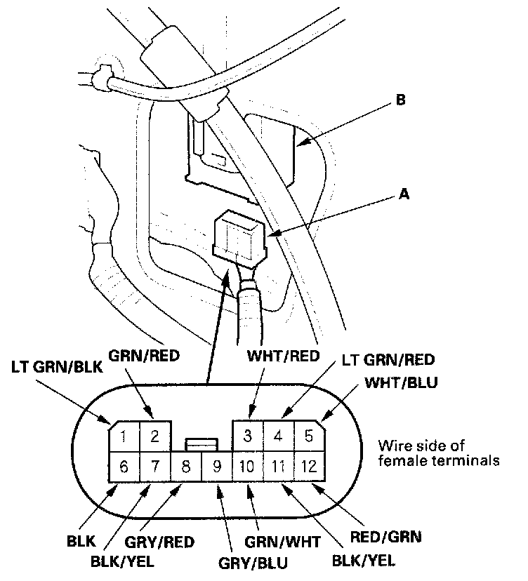 2. Disconnect the 12P connector (A) from the rear window wiper control unit (B).