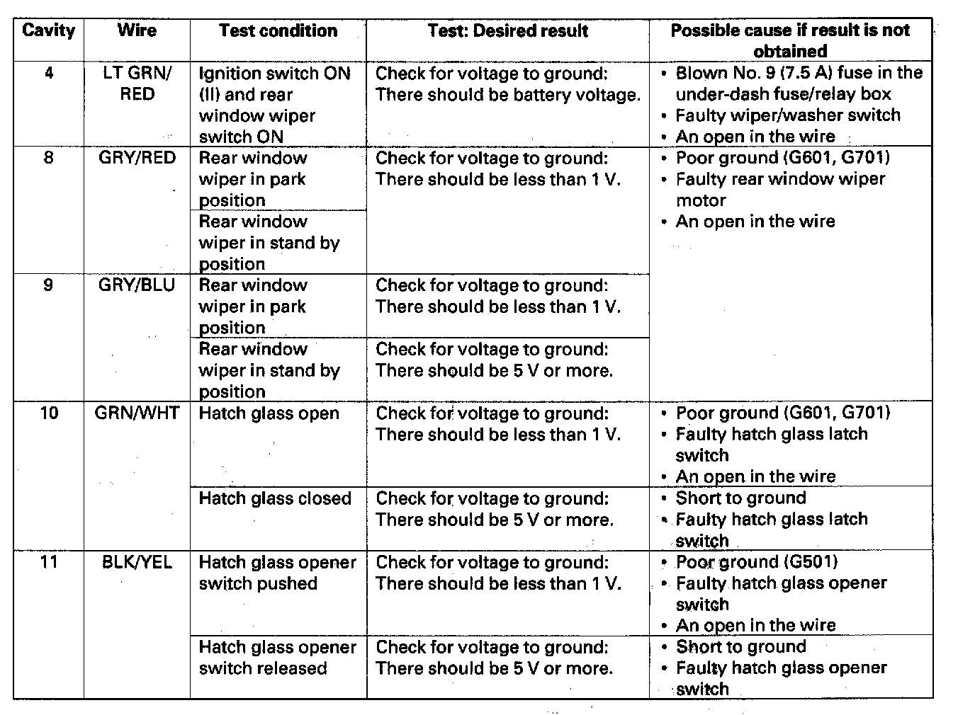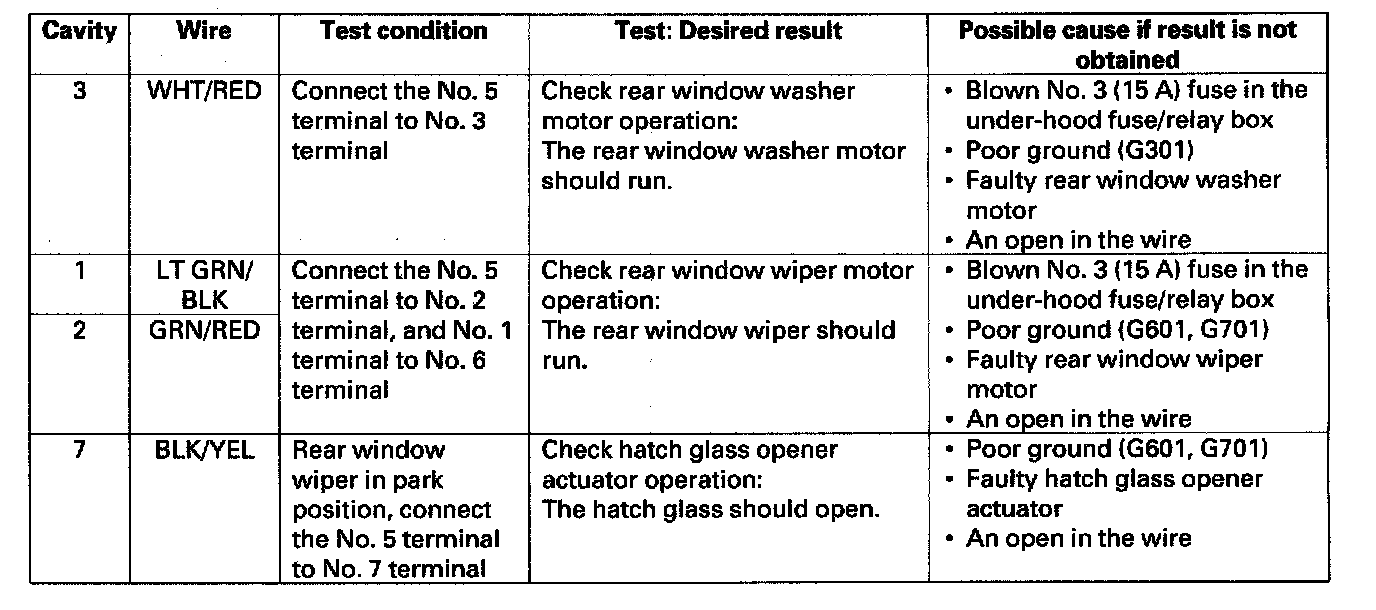 Home >> Honda >> 2005 >> CR-V 4WD L4-2.4L >> Repair and Diagnosis >> Wiper and Washer Systems >> Wiper Control Module >> Testing and Inspection >> Rear Window Wiper Control Unit Input Test