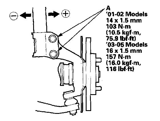NOTE: The camber angle can be adjusted up to ± 15' (center of tolerance) by replacing one damper pinch bolt with the adjusting bolt. The camber angle can be adjusted up to ± 30' by replacing both upper and lower damper pinch bolts with the adjusting bolts.