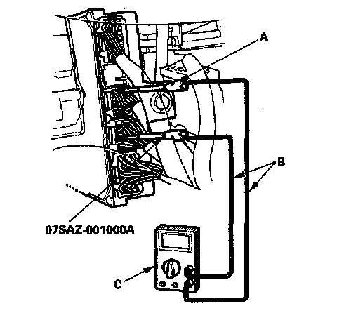 1. Connect the backprobe adapters (A) to the stacking patch cords (B), and connect the cords to a digital multi meter (C).