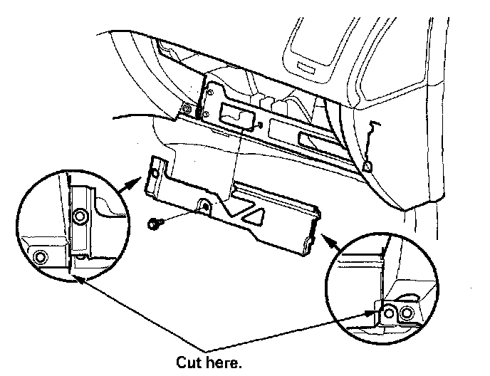 4 Remove the bolt. Cut the plastic cross brace in the glove box opening with diagonal cutters in the area shown, and discard it.