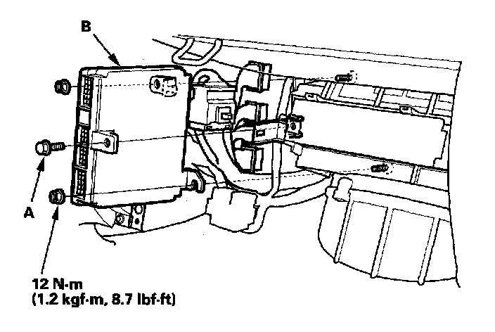 7. Remove the nuts, then remove the ECM/PCM (B).