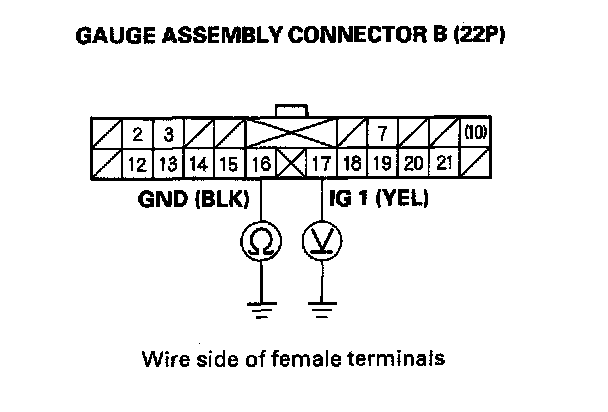 2. If the MIL does not come on, and the A/T gear position indicator P, N, or R does not come on. Turn the ignition switch off, remove the gauge assembly from the dashboard, then disconnect gauge assembly connector A (22P) and B (22P).