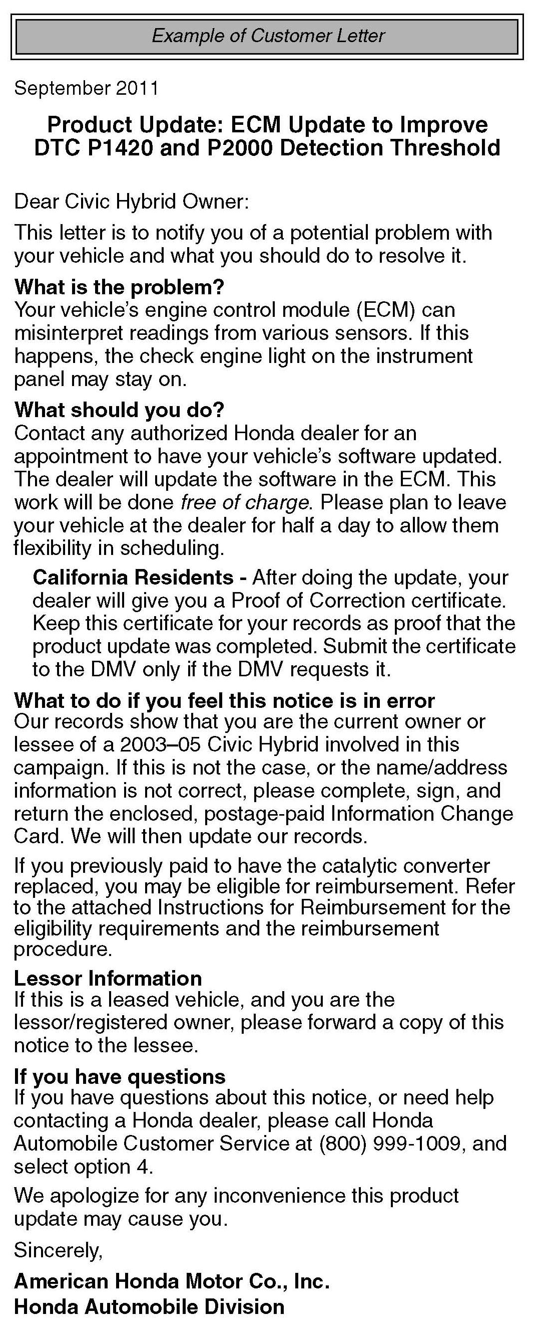 Home >> Honda >> 2005 >> Civic L4-1.7L SOHC >> Repair and Diagnosis >> Relays and Modules >> Relays and Modules - Powertrain Management >> Relays and Modules - Computers and Control Systems >> Engine Control Module >> Technical Service Bulletins >> All Technical Service Bulletins >> Campaign - ECM Update For DTC P1420/P2000 Detect