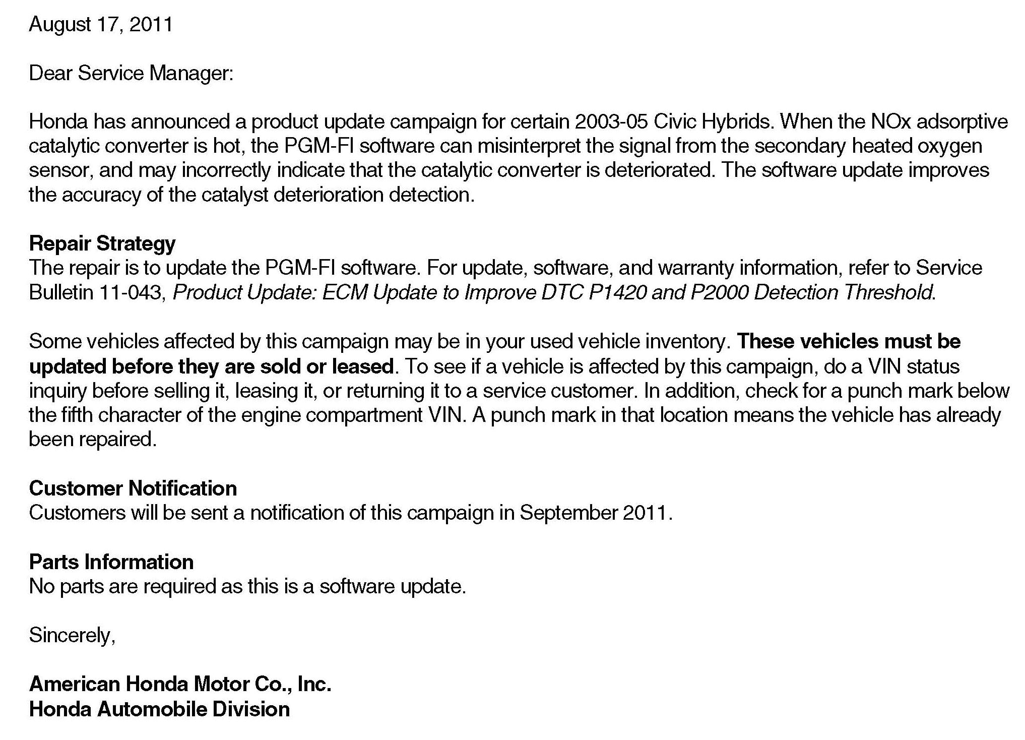 Do not submit a warranty claim for 2003-05 Civic Hybrid PZEV (KL) vehicles. These models are not affected by this product update.