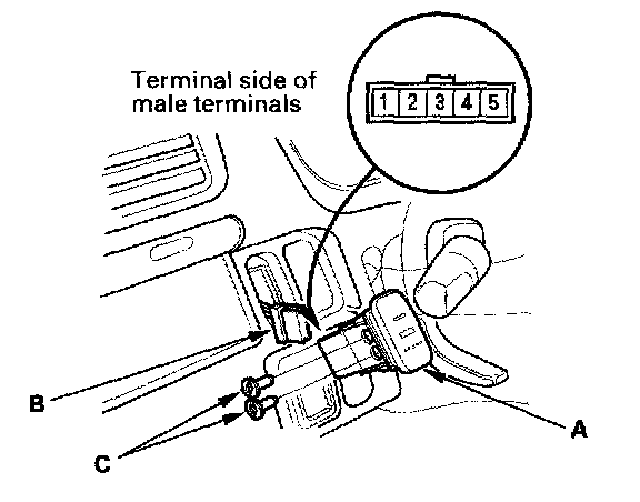 3. Check for continuity between the terminals in each switch position according to the table. If the continuity is not as specified, replace illumination bulbs (C) or the switch.