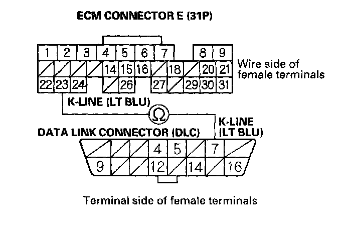 NO - Repair open in the wire between DLC terminal No.7 and the ECM (E23). After repairing the wire, check the DTC with the HDS or a scan tool, and go to the indicated DTC's troubleshooting.