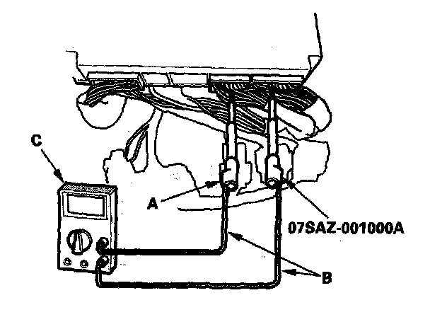 1. Connect the backprobe adapters (A) to the stacking patch cords (B), and connect the cords to a digital multimeter (C).
