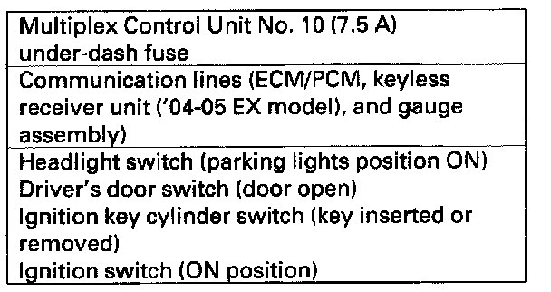Turn the ignition switch OFF, and remove the key. If the control unit receives no signals from the inputs listed, it will go into sleep mode in less than 40 seconds.