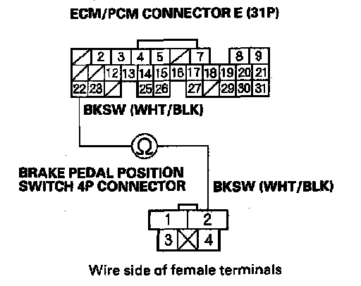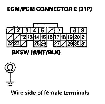9. Check for continuity between ECM/PCM connector terminal E22 and brake pedal position switch 4P connector terminal No.2.