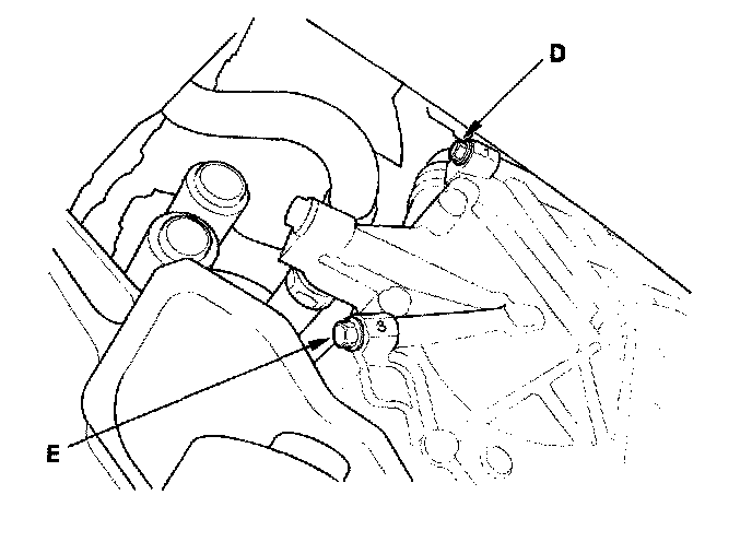 14. Hold in the 2 position at 2,000 rpm, shift into N for 1 second, then shift to the D position, and turn the overdrive off mode by pushing the O/D switch. Measure 3rd clutch pressure at the 3rd clutch pressure inspection hole (E) with holding engine speed at 2,000 rpm.