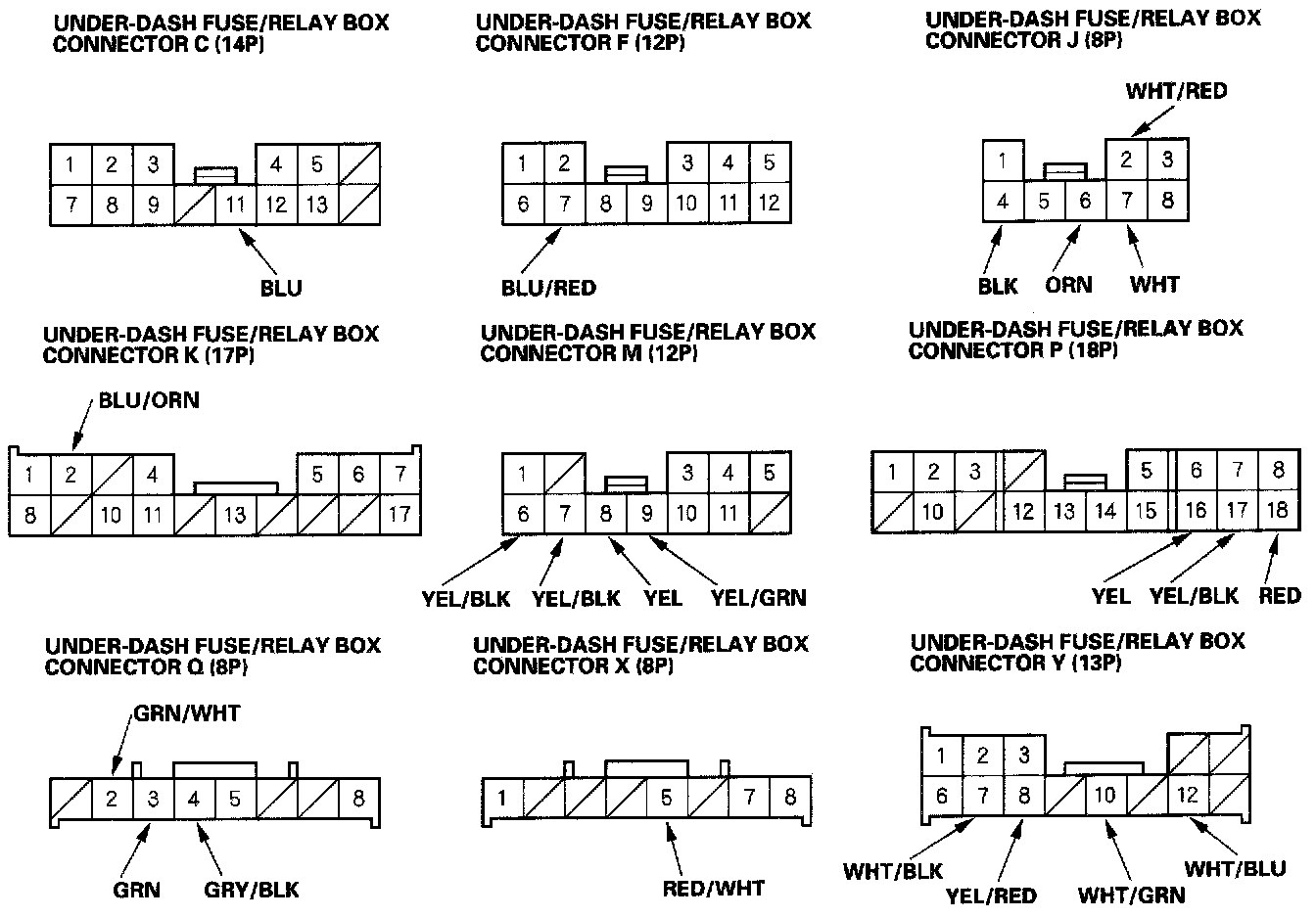 2. Disconnect the under-dash fuse/relay box connectors J, M, P, Q, X and Y.