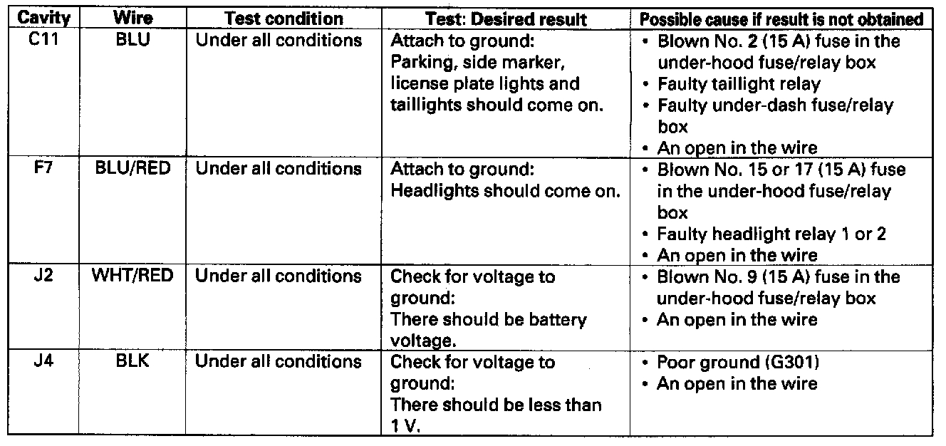 4. Reconnect all connections to the under-dash fuse/relay box, and make these input tests at the appropriate connectors on the under-dash fuse/relay box.