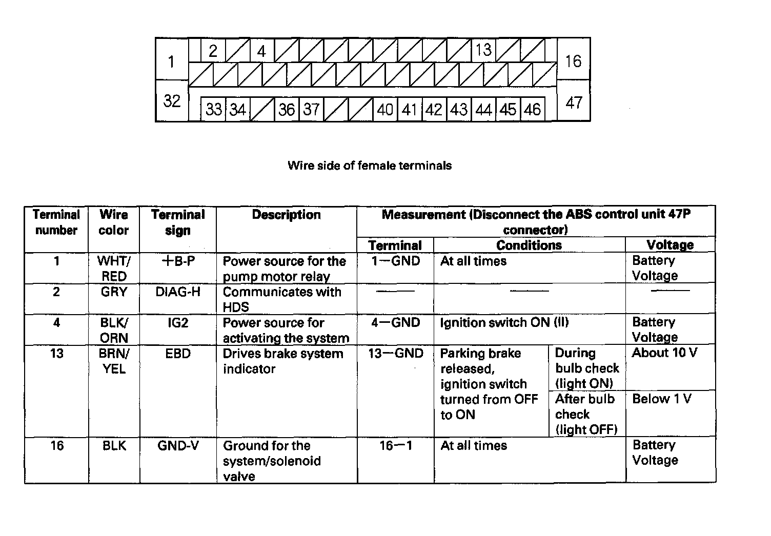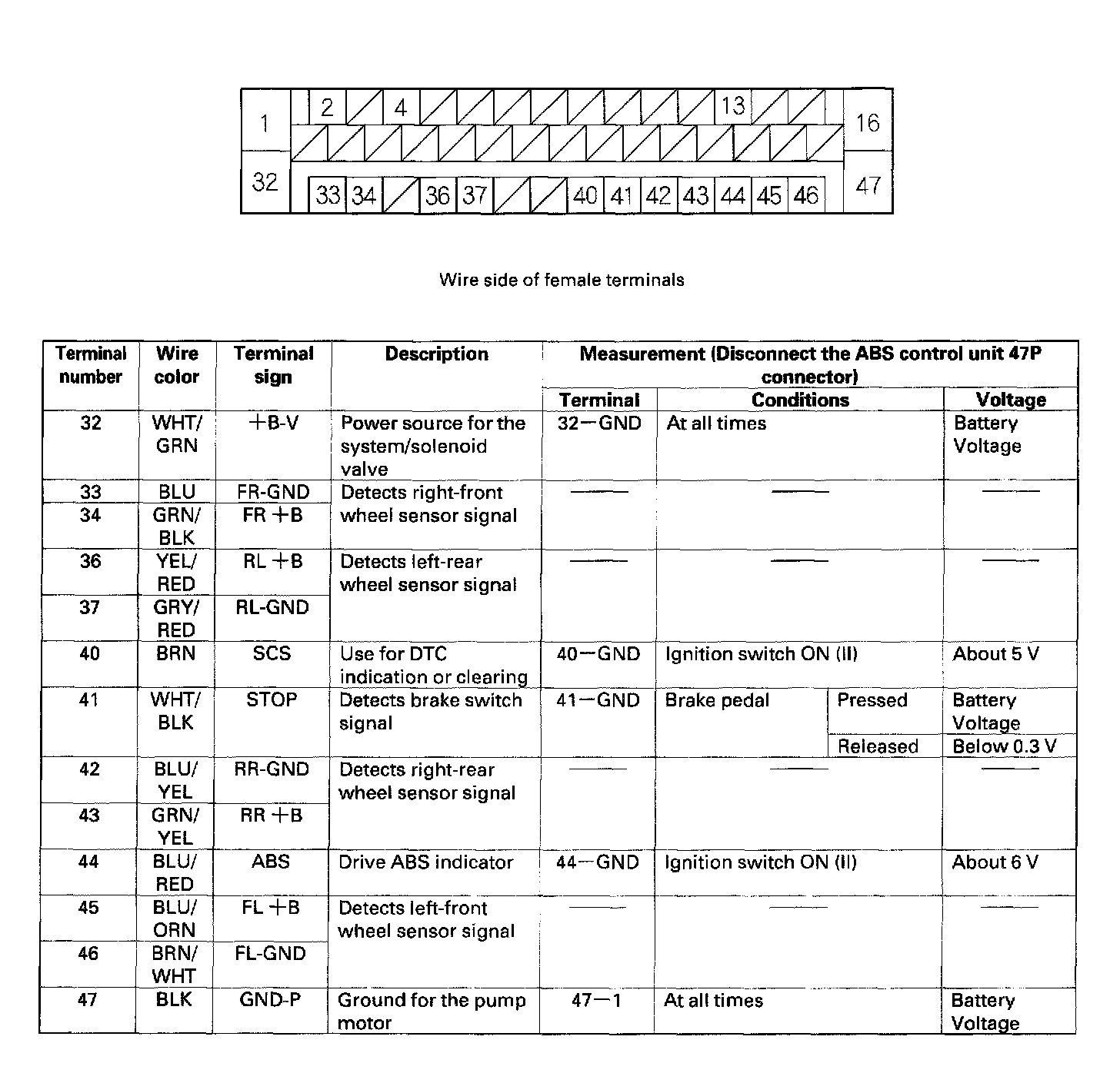 ABS Control Unit Inputs and Outputs for 47P Connector - Part 1: