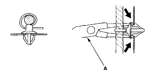 - Slip pliers (A) under the clip base and through the hole at an angle, then squeeze the expansion tabs to release the clip.