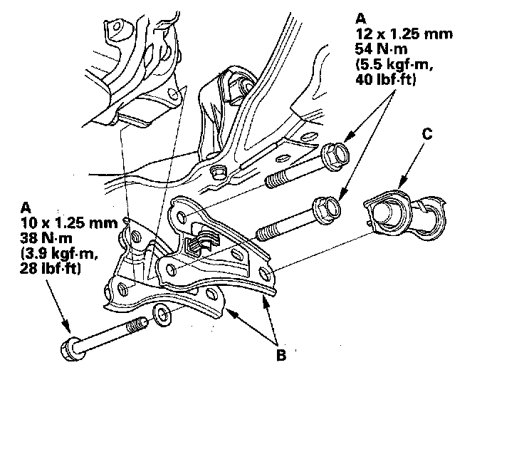 Install the right and left rear differential mount brackets B. then torque the bolts (A) and rear differential damper (C).