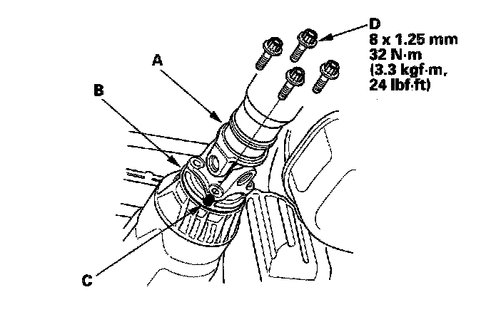 Install the No. 2 propeller shaft (A) onto the rear differential (B) by aligning the reference marks (C) made during removal. Make sure you use new mounting bolts (D).