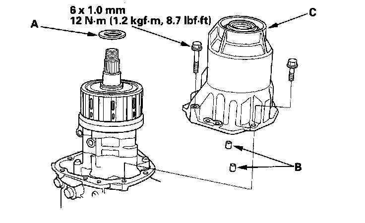 Install the 30 mm shim (A), the 6 x 1.0 mm dowel pins (B), and the torque control differential case (C). Torque the eight mounting bolts in a crisscross pattern in several steps
