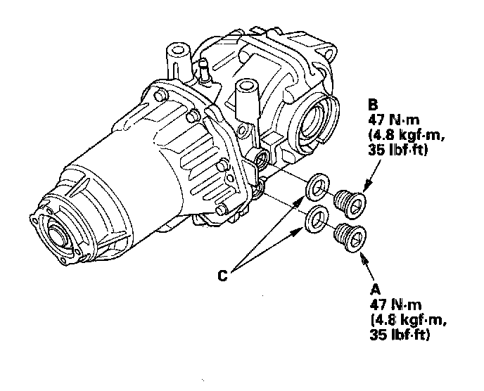 Install the drain plug (A) and the oil filler plug (B) with new washers (C)