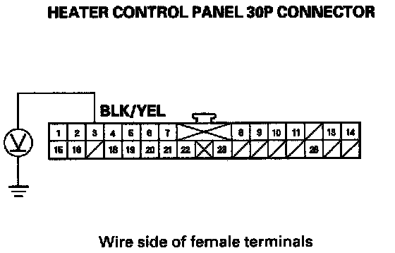 YES - Check for loose wires or poor connections at the heater control panel 30P connector. If the connections are good, substitute a known-good heater control panel, and recheck. If the symptom/indication goes away, replace the original heater control panel.