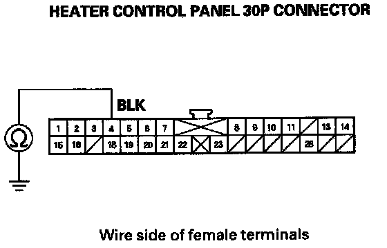 6. Check for continuity between the No.4 terminal of the heater control panel 30P connector and body ground.