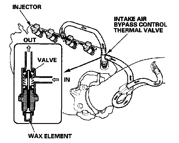 When the engine is cold, the intake air bypass control thermal valve sends air to the injector. The amount of air is regulated by engine coolant temperature. Once the engine is hot, the intake air bypass control thermal valve closes, stopping air to the injector.