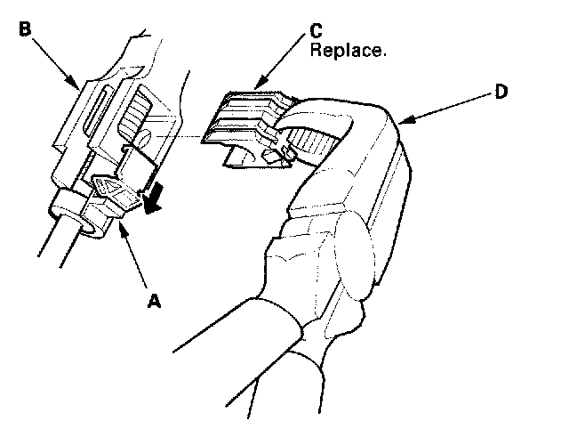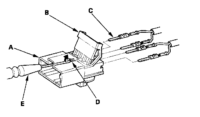 19. Remove the terminal (C) from the connector by pushing the lock tab (D) up in the connector using a thin blade screwdriver (E). Remove all four terminals.