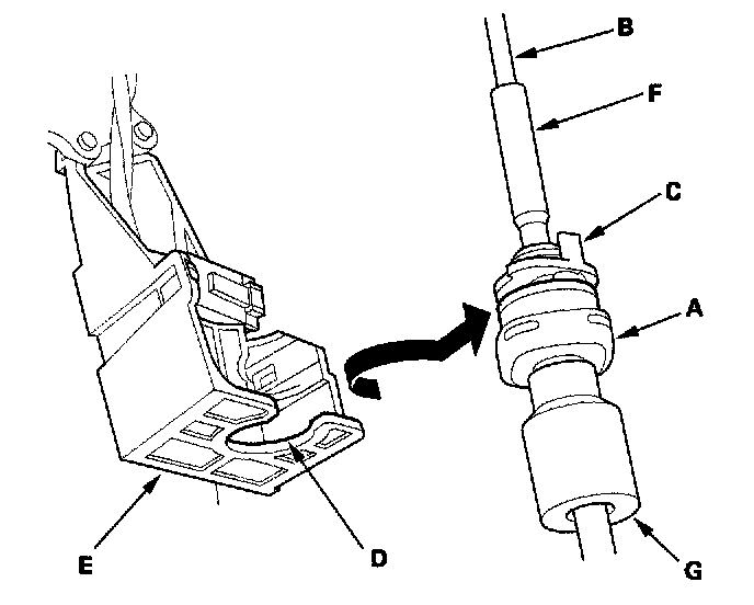 8. Rotate the socket holder (A) on the shift cable (B) a quarter turn; the tab (C) on the socket holder will be in the opening (D) of the shift cable bracket (E). Then slide the holder to remove the shift cable from the shift cable bracket. Do not remove the shift cable by twisting the shift cable guide (F) and damper (G).