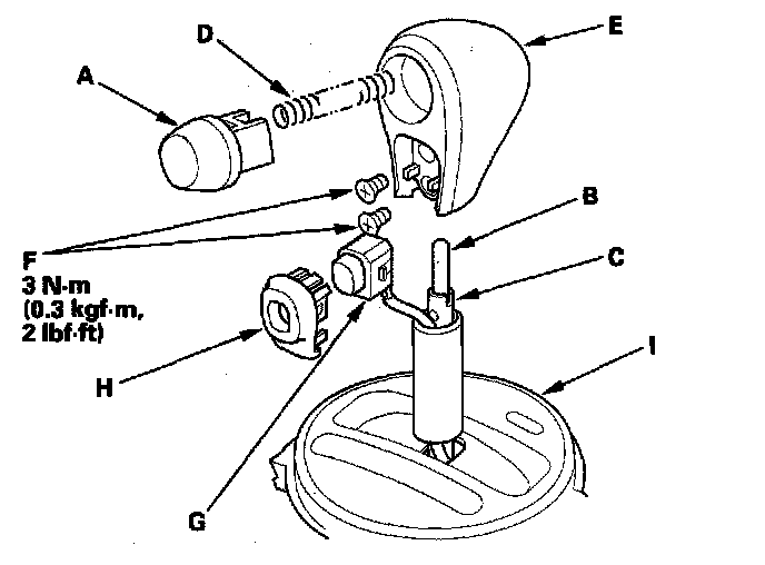25. Install the O/D switch (G) and the O/D switch cover (H), and install the A/T gear position indicator panel (I) on the shift lever bracket.