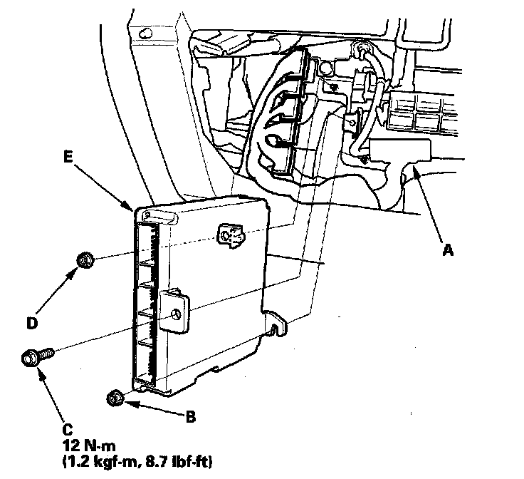 7. Lift the PCM up to clear the mounting nut on the lower right of the PCM, then pull out the PCM (E).