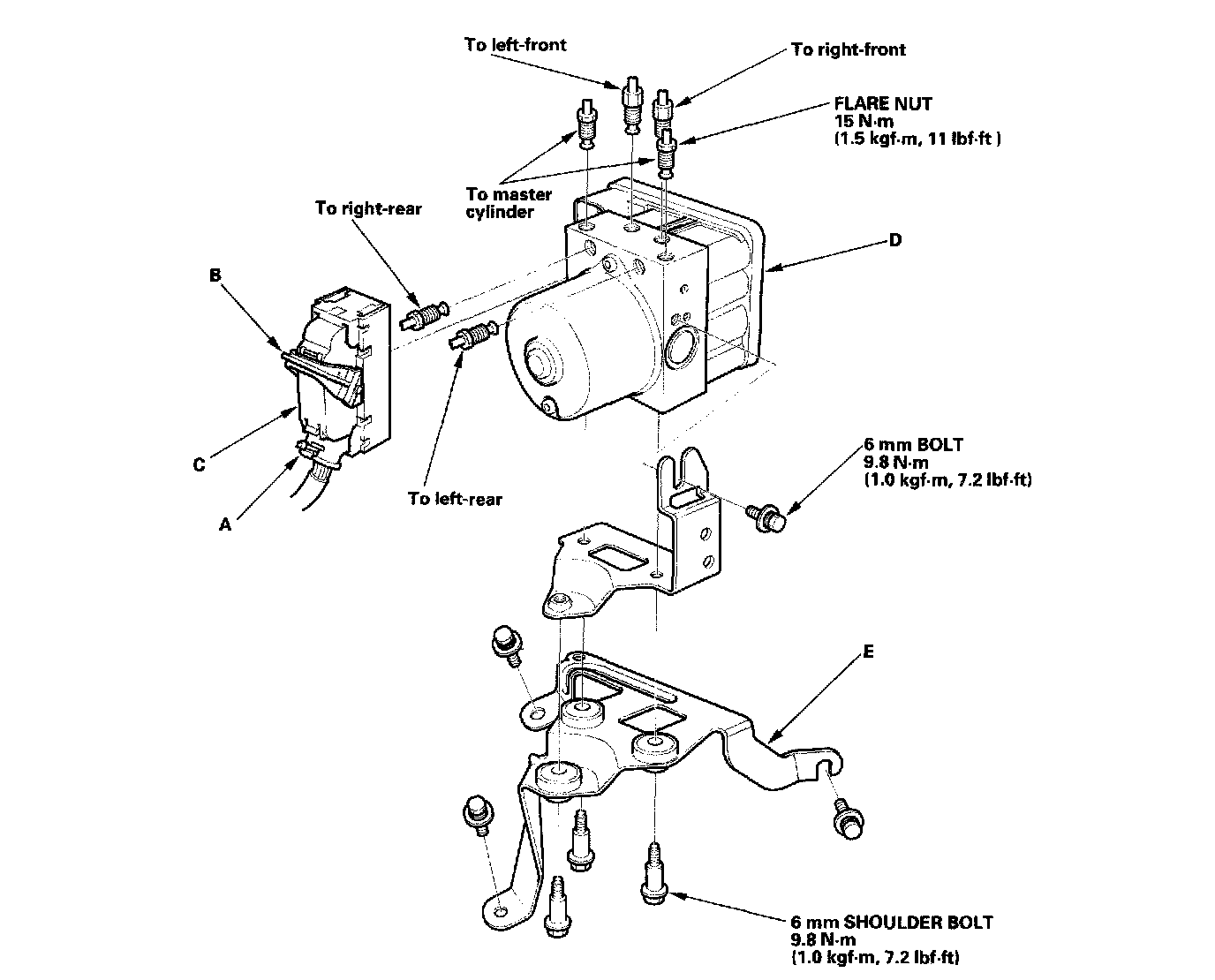3. Remove the ABS modulator-control unit (D)/bracket (E) from the body.