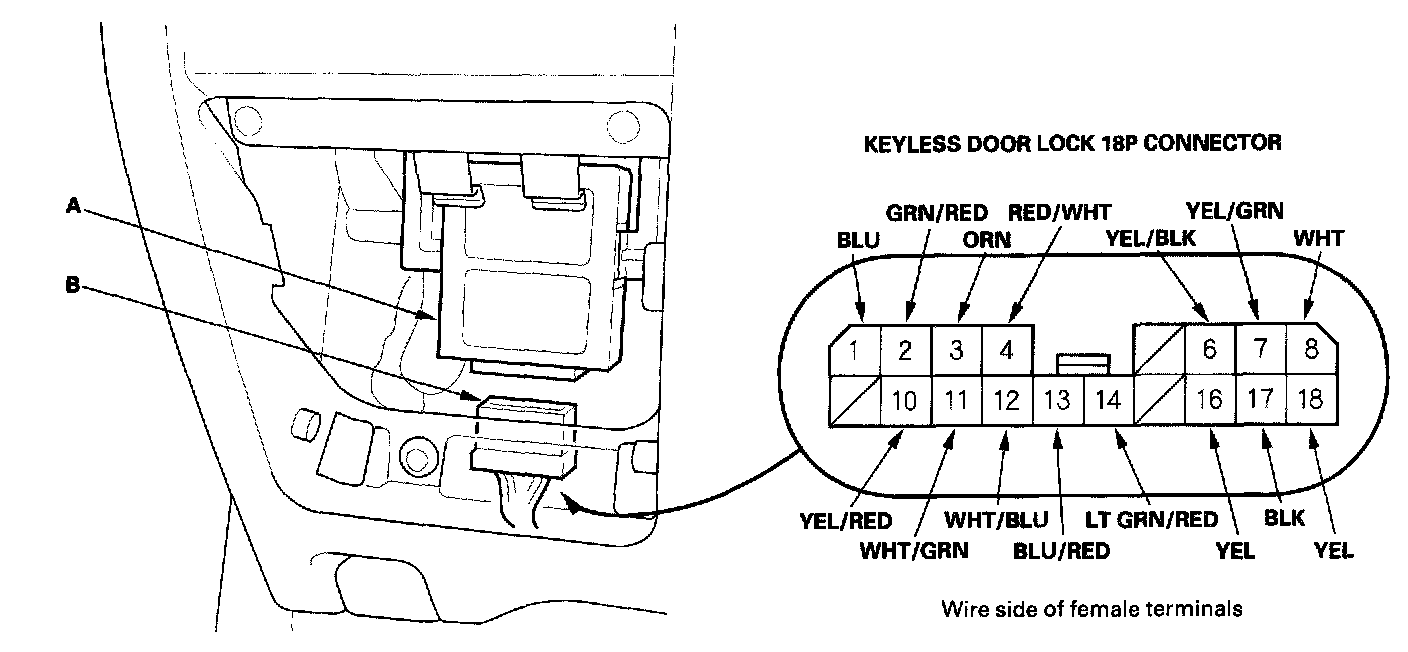 2. Disconnect the 18P connector (B) from the keyless door lock control unit (A).