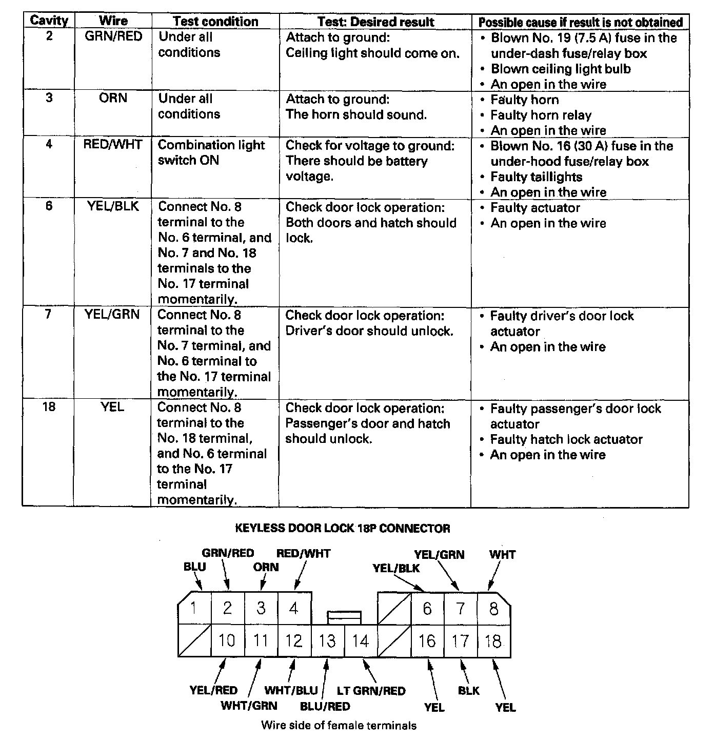 5. Reconnect the 18P connector to the keyless door lock control unit, and make these input tests at the connector.