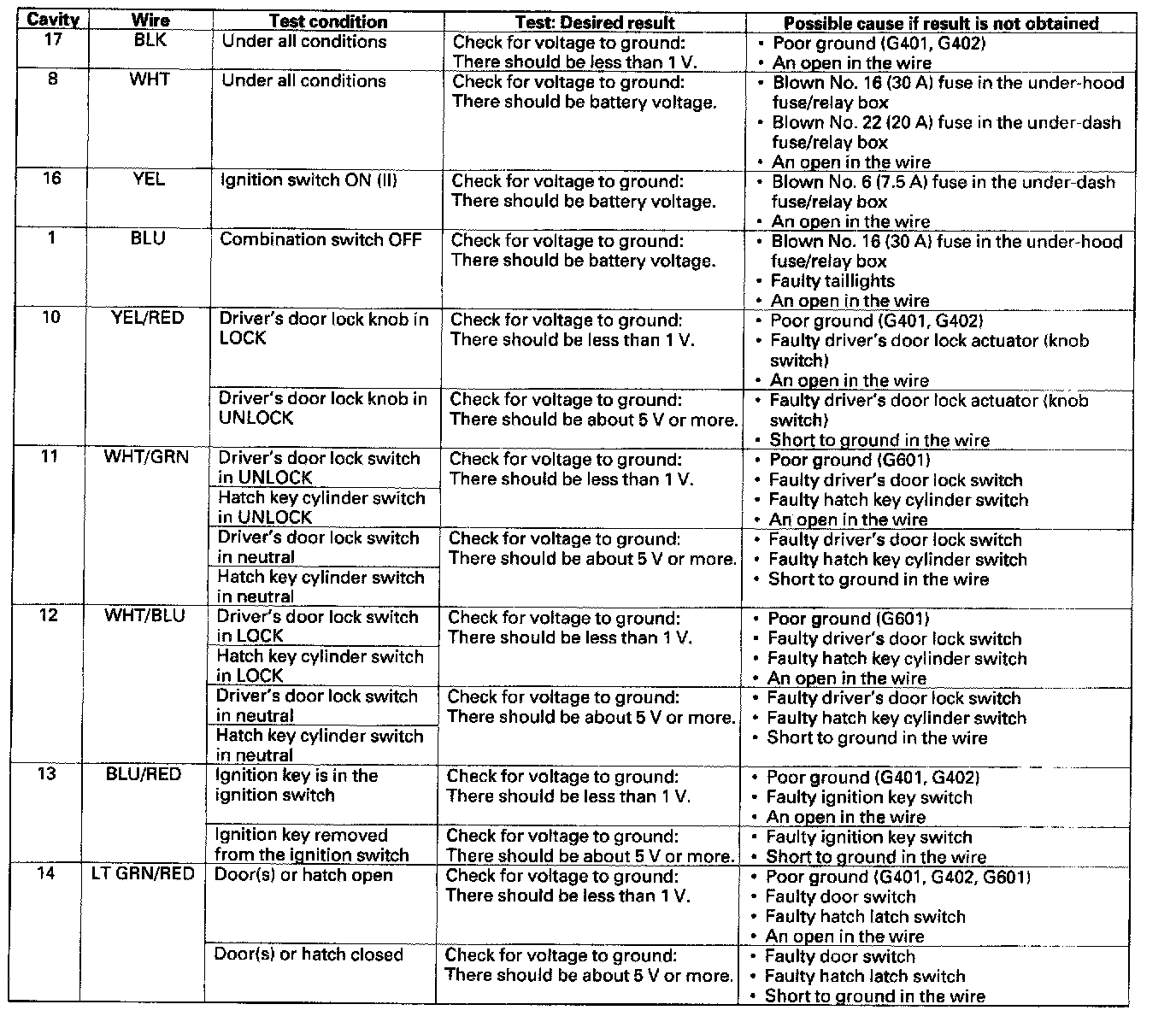 - If all the input tests prove OK, the control unit must be faulty; replace the keyless door lock control unit.