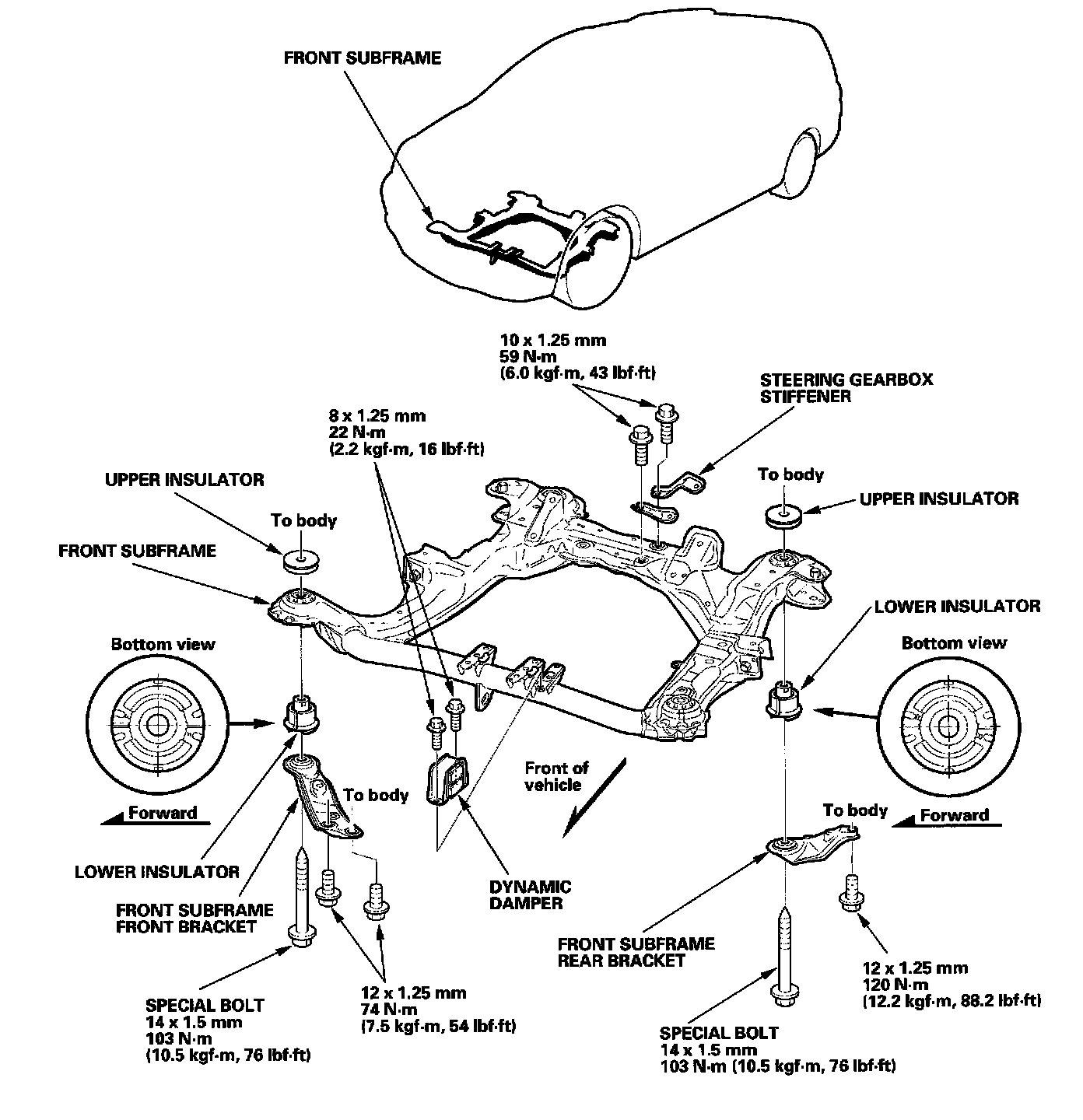 - After removing the subframe mounting bolts, be sure to replace them with new ones.