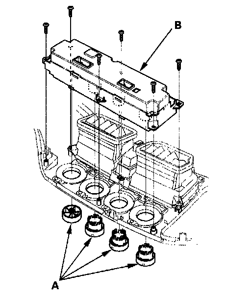 2. Remove the dials (A), the self-tapping screws, and the A/C control panel (B).