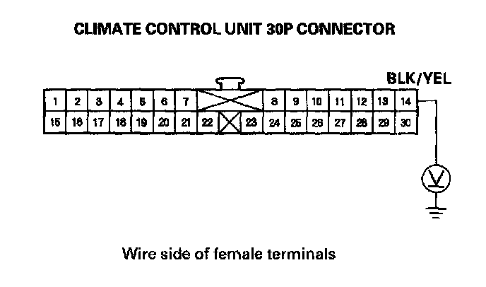 4. Measure the voltage between the No. 14terrninal of the climate control unit 30P connector and body ground.
