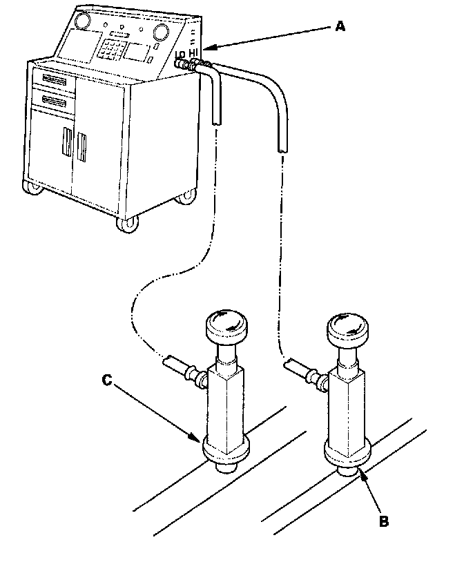 1. Connect an R-134a refrigerant recovery/recycling/charging station (A) to the high-pressure service port (B) and the low-pressure service port (C), as shown, following the equipment manufacturer's instructions.