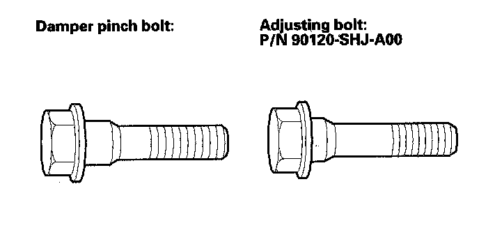 The front camber can be adjusted by exchanging one or both of the damper pinch bolts with a smaller diameter adjusting bolt, P/N 90120-SHJ-A00. The difference between the adjusting bolt diameter and the pinch bolt hole diameter allows for a small range of adjustment.