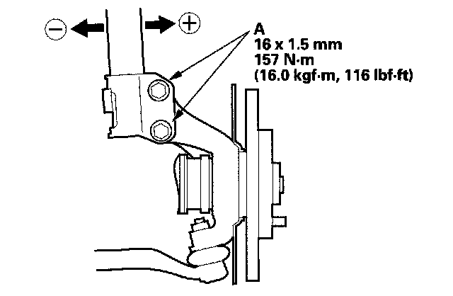 3. Loosen the flange bolts (A), and adjust the camber by moving the bottom of the damper within the range of the damper pinch bolt free play. Tighten the flange nuts to the specified torque.