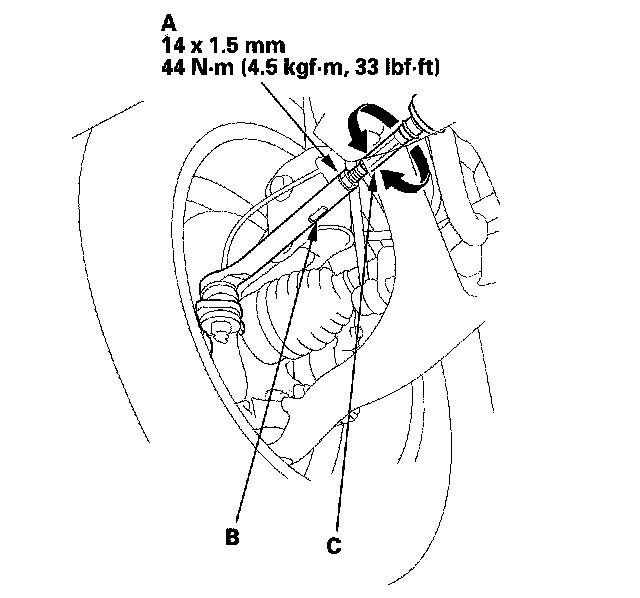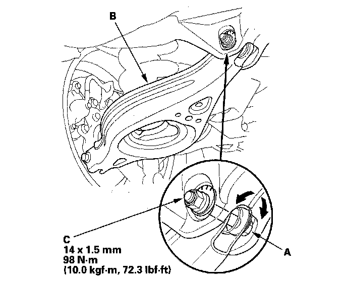 3. Hold the adjusting bolt (A) on the rear lower arm B, and remove the self-locking nut (C).