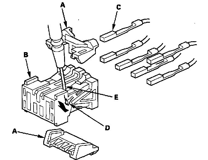 5. Remove the terminal (C) from the connector by pushing the lock tab (D) in the connector using a thin blade screwdriver (E). Remove all six terminals, and replace the connector.