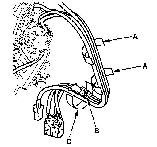 10. Install the A/T gear position indicator panel light harness (RED/BLK) (C) in the No. 4 and No. 5 cavities. Either A/T gear position indicator panel light harness terminal can be installed in the No. 4 and No. 5 cavities.